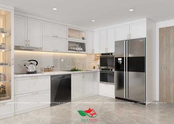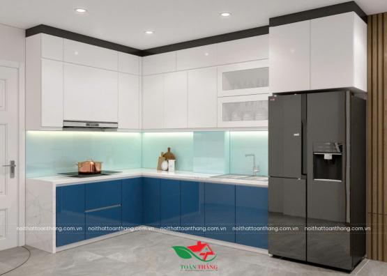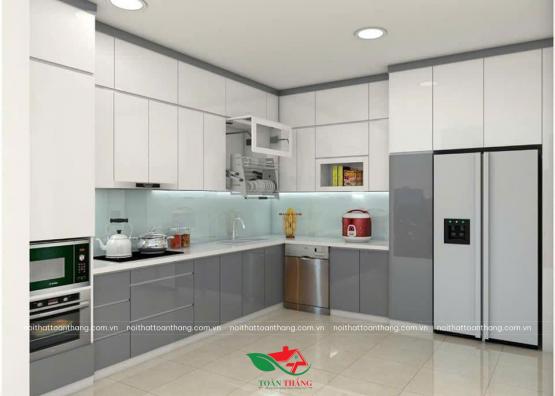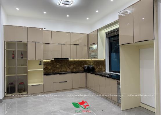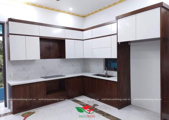 Tủ bếp hình chữ L có đầy đủ công năng, ngăn tủ, khu vực nấu nướng, lưu giữ đồ dùng, tủ lạnh và các thiết bị bếp khác. Nên mang đến sự tiện nghi nhất cho gia đình anh. Sau khi nhận bàn giao thành phẩm, anh Cường rất vui và chia sẻ: "Gia đình anh vô cùng hài lòng về mẫu tủ bếp, cũng như sự phục vụ tận tình chuyên nghiệp của đội ngũ nội thất Toàn Thắng."