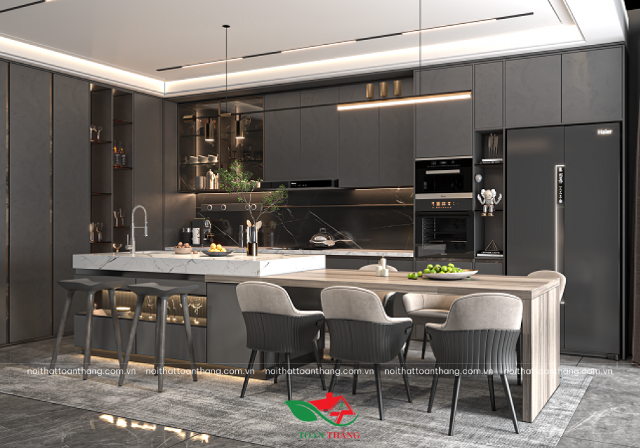 Sự đồng bộ màu sắc giữa tủ bếp, đảo bếp và hệ tủ cao mang lại cảm giác sang trọng, liền mạch, kết hợp ánh sáng đèn LED âm trần và đèn thả giúp không gian thêm chiều sâu và đẳng cấp.