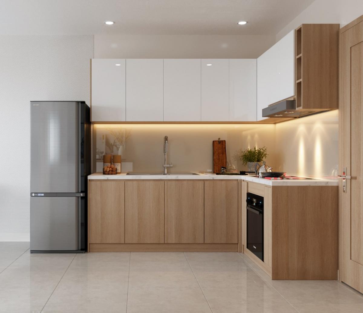 - Tủ bếp nên tựa lưng vào một mặt tường