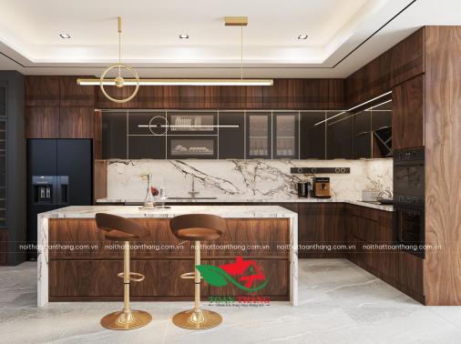 Tủ bếp gỗ óc chó hiện đại kết hợp đảo bếp sang trọng, tối ưu công năng