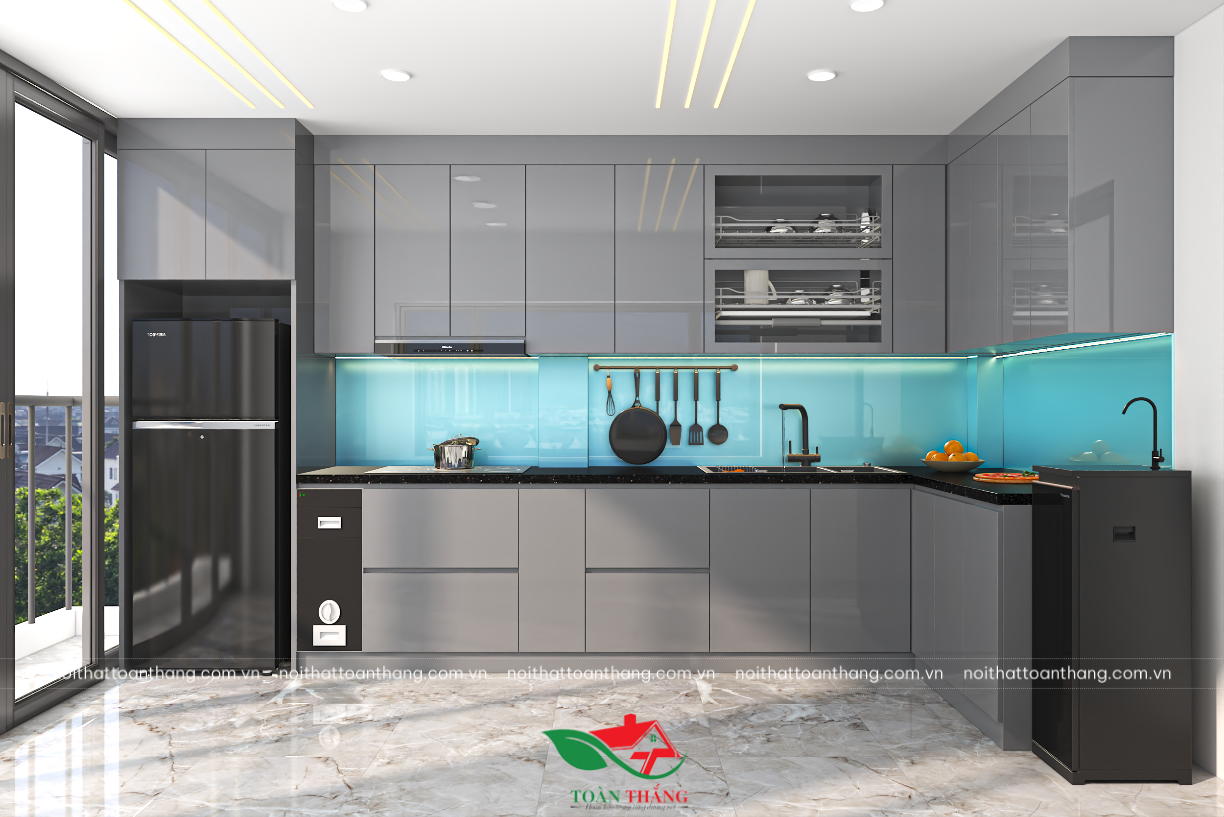 Hiệu Ứng Không Gian: Trong không gian nhỏ, màu xám ghi bóng giúp phản chiếu ánh sáng từ ban công lớn và hệ thống đèn trần, khiến căn bếp có cảm giác rộng rãi và thoáng đãng hơn.
