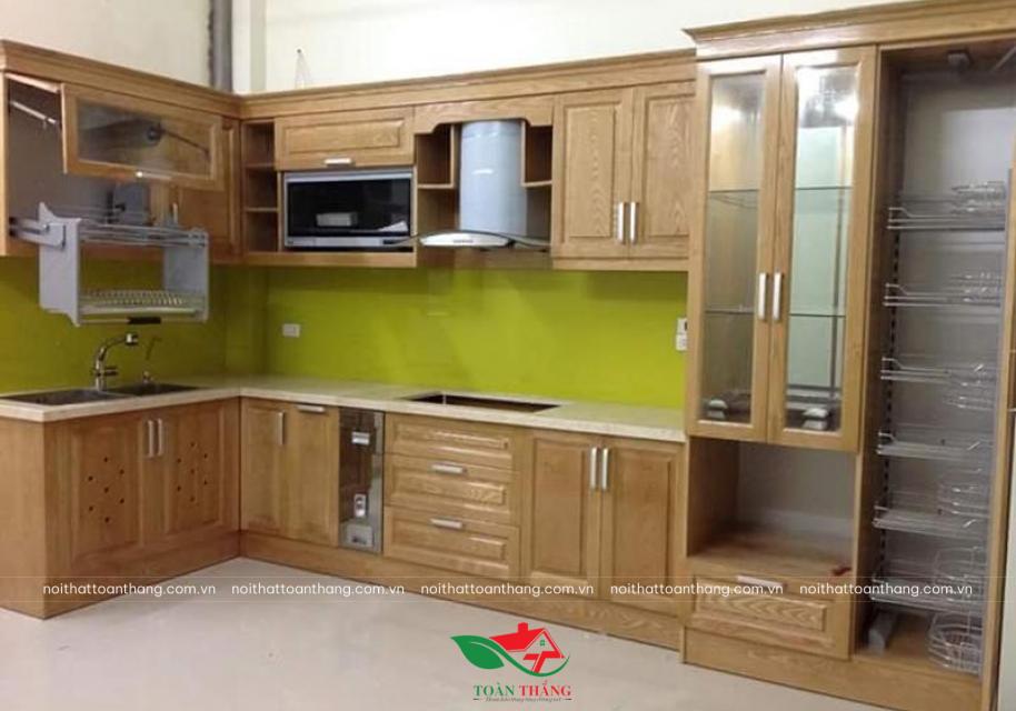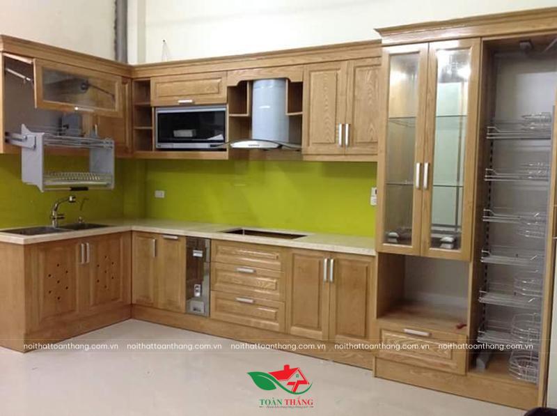 Tủ bếp gỗ Sồi Nga được thiết kế theo kiểu dáng hai tầng có đầy đủ tiện nghi giúp hỗ trợ gia chủ thuận lợi hơn trong quá trình nấu nướng thức ăn.