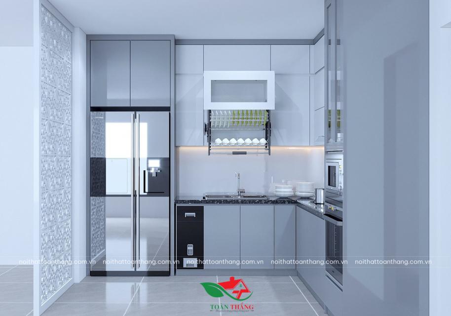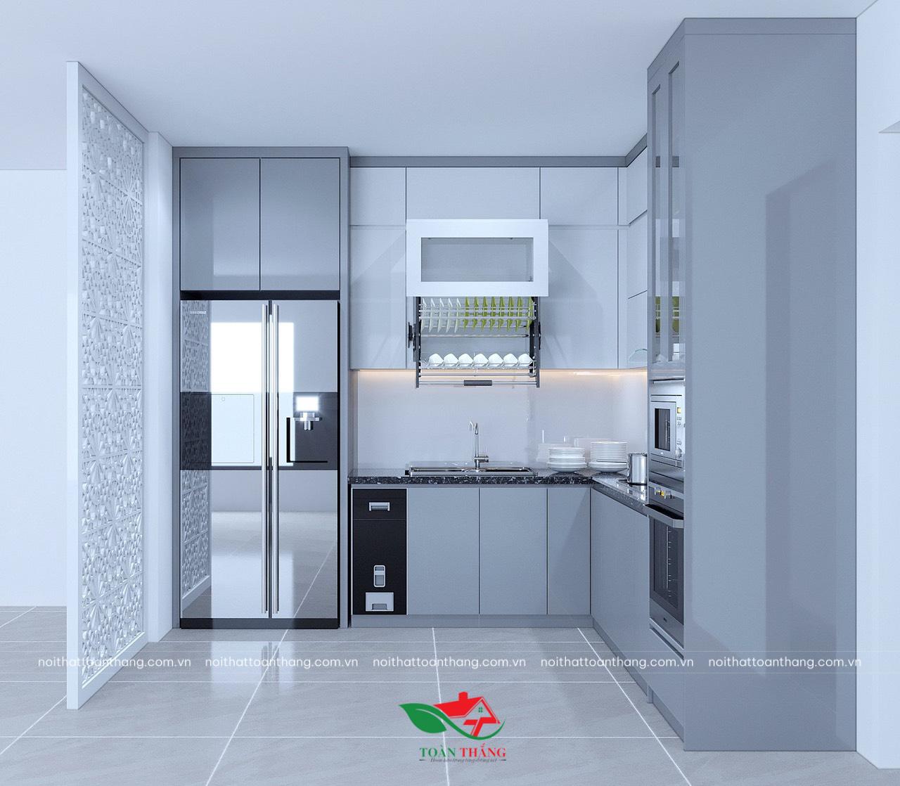 Tủ bếp thùng inox 304 cánh acrylic màu xám xanh sang trọng