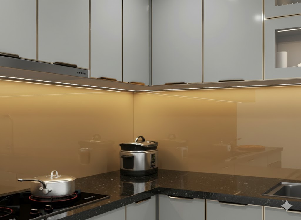 - Sắc vàng trà tạo ra độ ấm vừa phải, giúp trung hòa cảm giác lạnh của inox và ghi xám, làm cho không gian trở nên ấm cúng, hài hòa hơn. Khi ánh sáng LED hắt xuống, lớp kính tạo hiệu ứng phản chiếu mờ, khiến không gian bếp trở nên sâu hơn và rộng hơn.