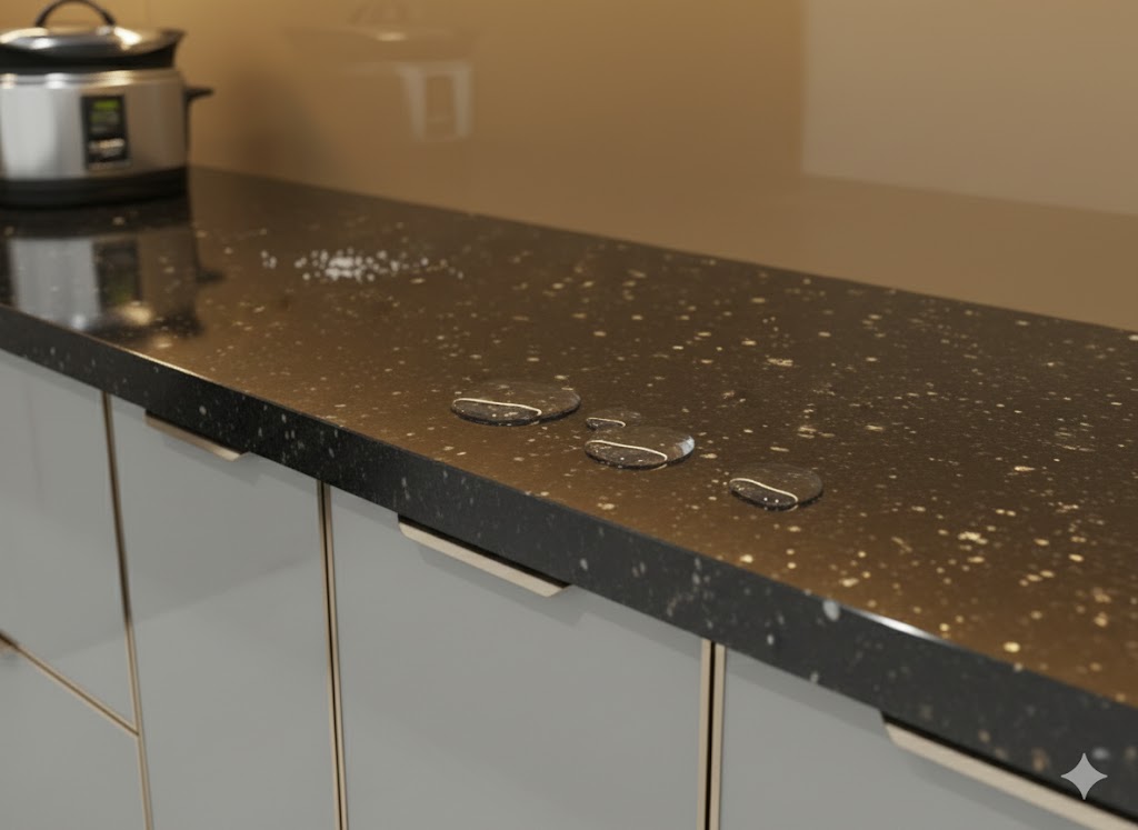 Để hoàn chỉnh tổng thể, hệ tủ sử dụng đá đen kim sa cho mặt bàn. Màu đen phản ứng rất tốt với tông xám – vàng, giúp không gian có chiều sâu và tạo cảm giác chắc chắn, vững chãi.