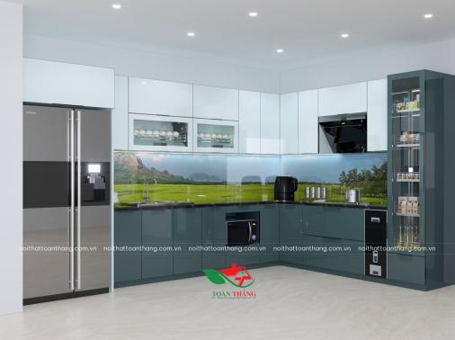 Tủ Bếp Inox Cánh Kính Kiểu Dáng Chữ L, Kính Bếp Trắng Xanh