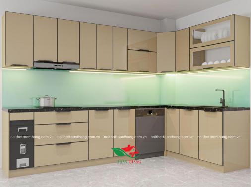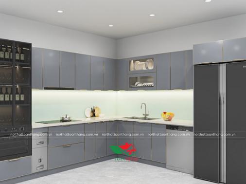 Tủ Bếp Inox Cánh Kính Màu Xám Hiện Đại, Chữ L