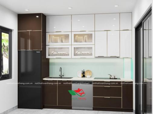 Tủ Bếp Inox Cánh Kính Đen Kết Hợp Màu Be, Mặt Kính Vàng Nổi Bật