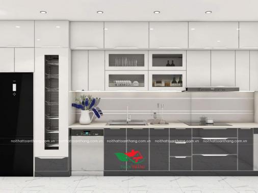Tủ Bếp Inox Cánh Kính Kiểu Dáng Chữ L, 6 mét dài màu Trắng Đen kết hợp