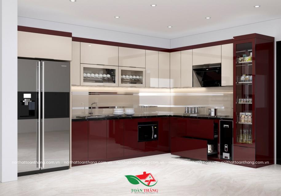- Tông màu Beige (Vàng kem) hoặc Nude được sử dụng cho tủ trên, đóng vai trò là màu nền cân bằng, làm dịu đi sự mạnh mẽ của màu Đỏ Đun.