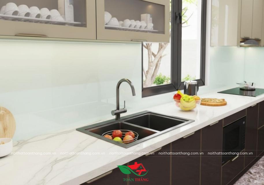 Sự kết hợp giữa inox và kính mang đến phong cách hiện đại, tinh tế, dễ phối với thiết bị bếp cao cấp và nhiều phong cách nội thất khác nhau, phù hợp cho những gia đình muốn không gian bếp đẹp lâu dài, không lo lỗi xu hướng.