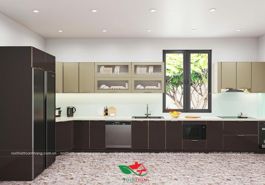 • Tối Ưu Diện Tích: Thiết kế chữ L tận dụng được hai bức tường vuông góc, tạo ra không gian lưu trữ và bề mặt làm việc lớn, đồng thời giữ được khu vực trung tâm bếp (lối đi) thông thoáng.