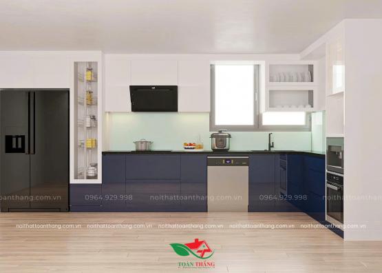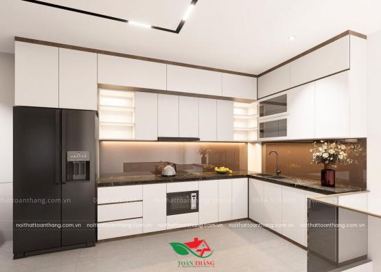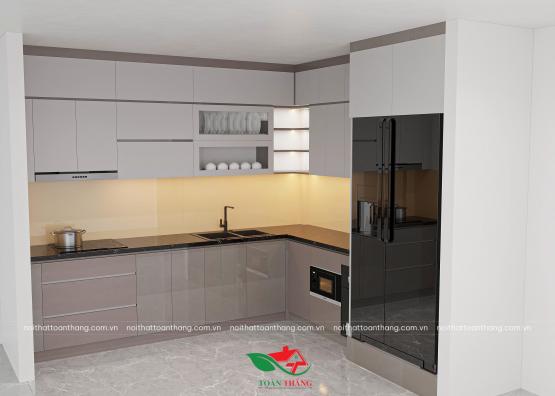 - Mẫu bếp tận dụng triệt để góc phòng với thiết kế chữ L, giúp mở rộng không gian đứng bếp và tạo ra quy trình nấu nướng liền mạch. Đặc biệt, hệ tủ bếp trên được thiết kế kịch trần, không chỉ giúp tăng diện tích lưu trữ gấp đôi mà còn loại bỏ hoàn toàn việc bụi bẩn bám trên đỉnh tủ – một nỗi ám ảnh của các bà nội trợ. Các cánh tủ được thiết kế phẳng, không tay nắm, tạo ra một bề mặt trơn láng, sạch sẽ và vô cùng tinh tế.