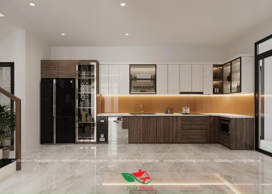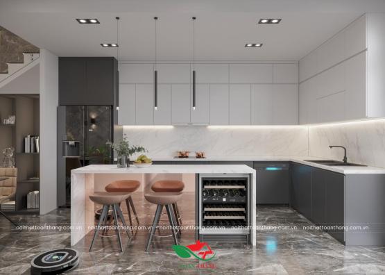 - Bên cạnh khu vực chế biến, một hệ tủ kho tích hợp với kệ rượu đứng là chi tiết đắt giá nhất của thiết kế. Kệ rượu được chia ngăn khoa học, không chỉ để lưu trữ mà còn là nơi trưng bày, khẳng định gu thẩm mỹ của gia chủ. Việc tích hợp lò nướng và lò vi sóng vào một cột tủ đứng giúp tiết kiệm diện tích mặt bếp, tạo ra một diện mạo ngăn nắp và chuyên nghiệp như những căn bếp Âu châu hiện đại.
