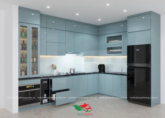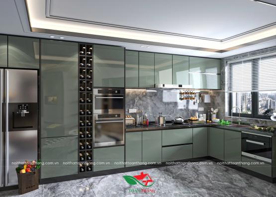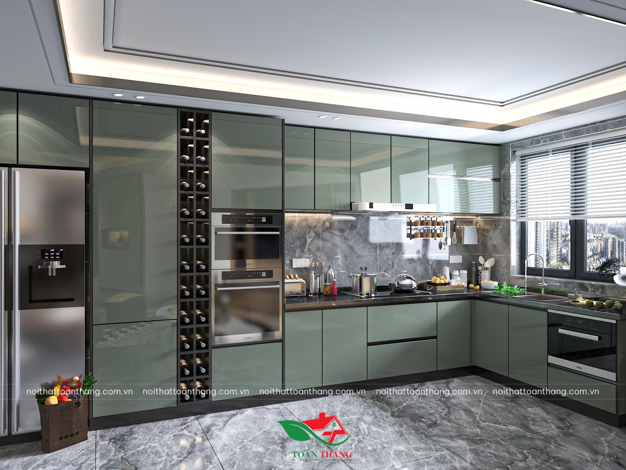 - Tông màu chủ đạo của hệ cánh tủ là xanh Sage – một gam màu xanh có pha chút xám khói bụi bặm nhưng vô cùng cao cấp. Khác với những màu sắc rực rỡ gây mỏi mắt, xanh Sage mang lại cảm giác bình yên, thư thái và gần gũi với thiên nhiên. Khi được phủ trên bề mặt Acrylic bóng gương, sắc xanh này trở nên sống động hơn nhờ hiệu ứng phản chiếu, tạo ra độ sâu thị giác giúp căn bếp trông rộng rãi và thoáng đạt hơn rất nhiều.
