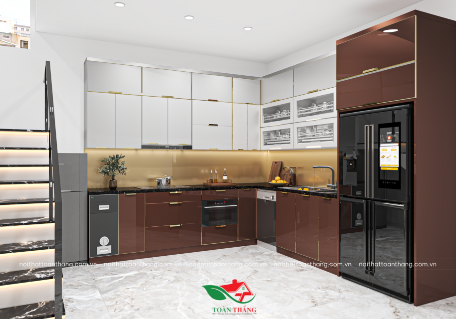 Các ngăn tủ được bố trí theo nguyên tắc tam giác vàng trong bếp (bếp nấu – bồn rửa – tủ lạnh) giúp việc nấu nướng trở nên nhanh gọn, tiện lợi. Toàn bộ tay nắm âm, bản lề giảm chấn, giúp việc mở đóng êm ái, không gây tiếng ồn.