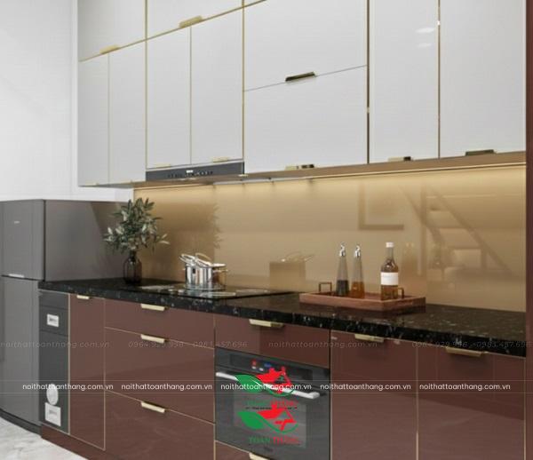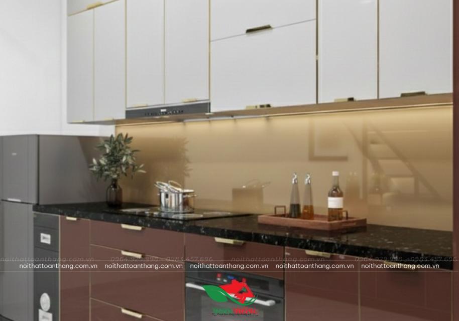 Bề mặt kính bóng nhẹ giúp phản chiếu ánh sáng, khiến căn bếp trông thoáng và rộng hơn so với diện tích thực tế.