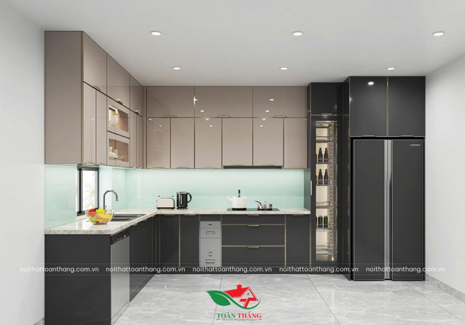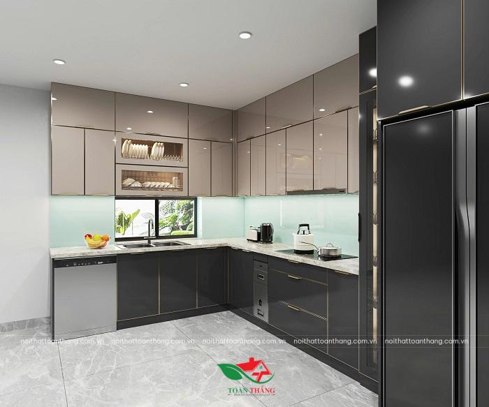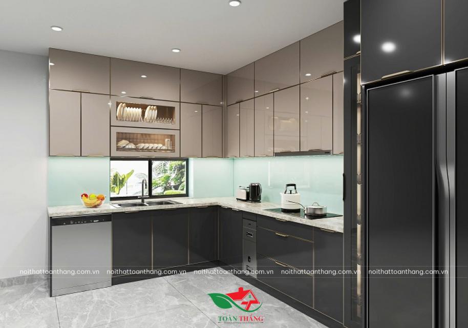 Mẫu tủ bếp inox cánh kính chữ L gây ấn tượng mạnh bởi sự tương phản đầy tinh tế giữa sắc be trang nhã và đen quyền lực. Thiết kế được nâng tầm công năng nhờ hệ quầy đảo đa năng, mở rộng không gian sơ chế và tạo sự liền mạch cho căn bếp.