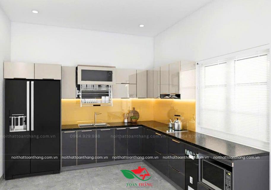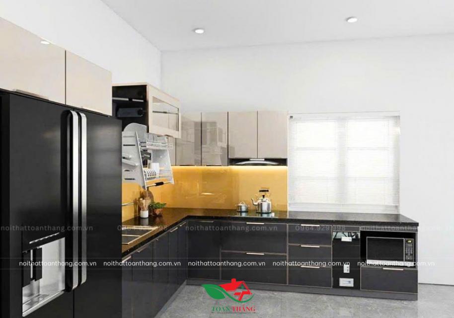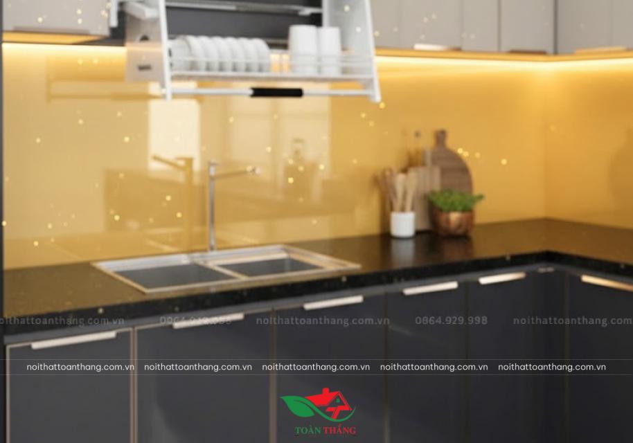 Tủ Bếp Inox Cánh Kính Đen Kết Hợp Màu Be, Mặt Kính Vàng Nổi Bật