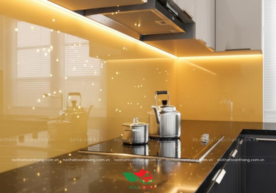 Sự kết hợp giữa inox và kính mang đến phong cách hiện đại, tinh tế, dễ phối với thiết bị bếp cao cấp và nhiều phong cách nội thất khác nhau, phù hợp cho những gia đình muốn không gian bếp đẹp lâu dài, không lo lỗi xu hướng.