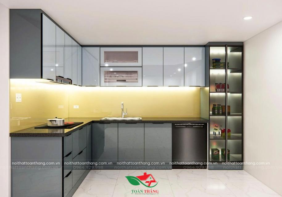 Thiết kế tủ bếp inox cánh kính chữ L xanh ghi hiện đại
