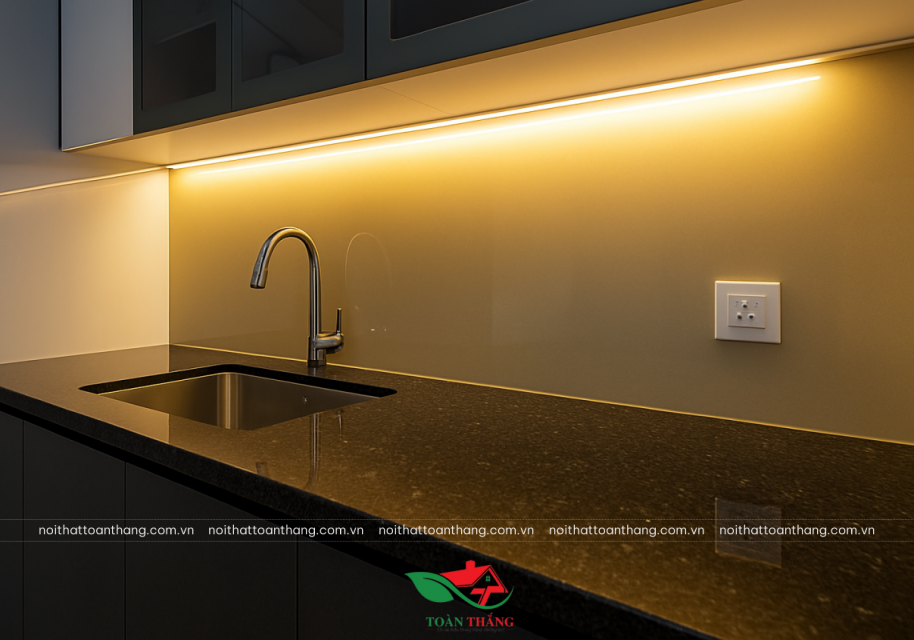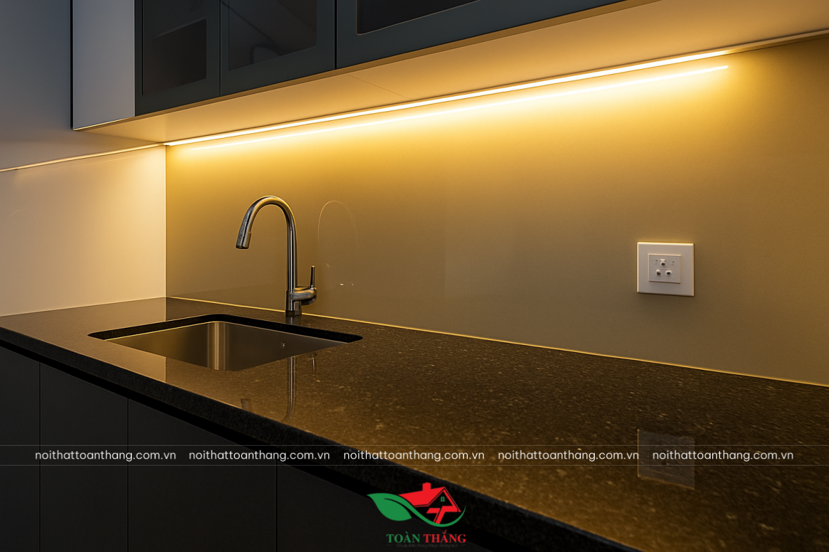 Khi ánh đèn trần và đèn hắt chiếu lên, bề mặt kính phản xạ nhẹ, giúp tủ bếp trông bóng bẩy và cao cấp hơn rất nhiều so với bề mặt laminate hay gỗ sơn.