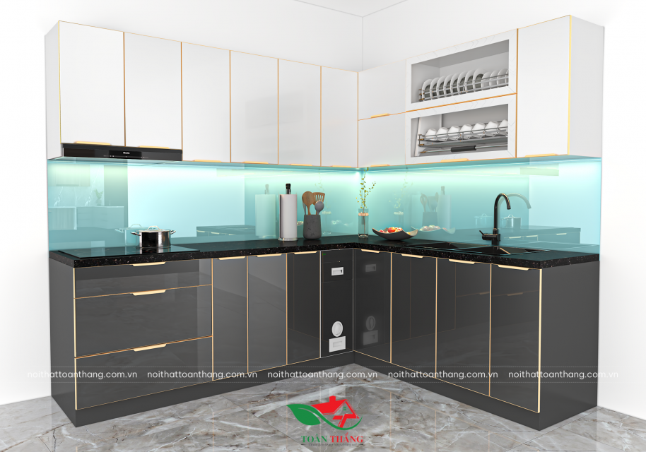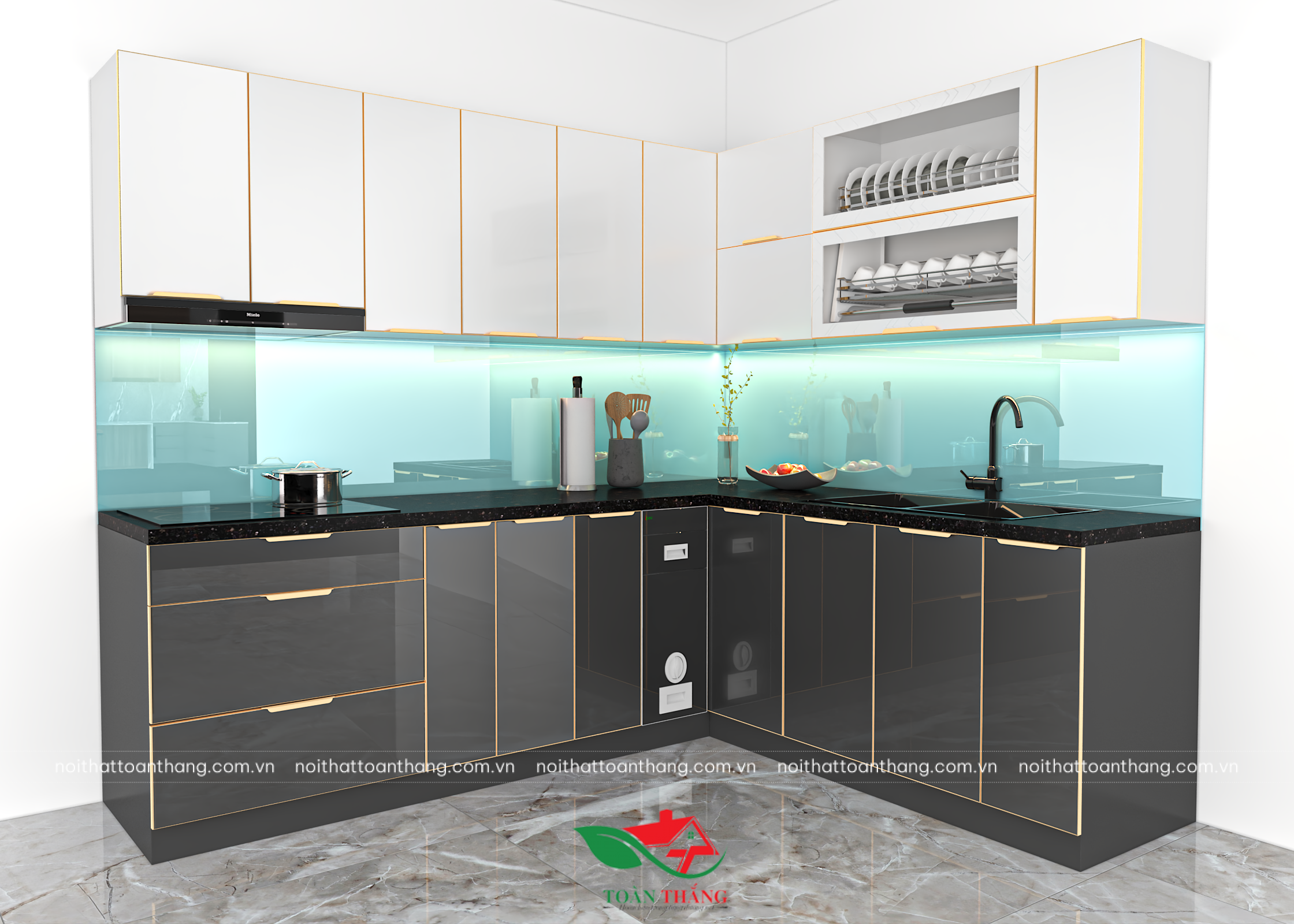 Tủ Bếp Inox Cánh Kính Kiểu Chữ L Đơn Giản Tone Màu Trắng - Đen