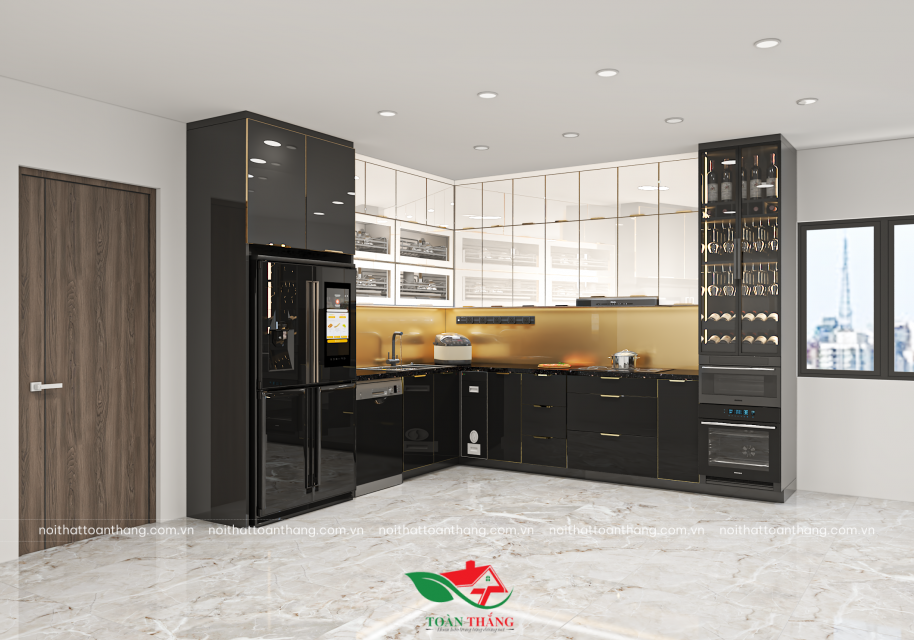 - Phần tủ trên sử dụng cánh kính trắng viền nhũ vàng Champagne, tạo cảm giác sang trọng nhưng không nặng nề. Sự pha trộn giữa sắc trắng và ánh vàng làm cho không gian bếp bừng sáng, cân bằng lại sự mạnh mẽ của màu đen bên dưới.