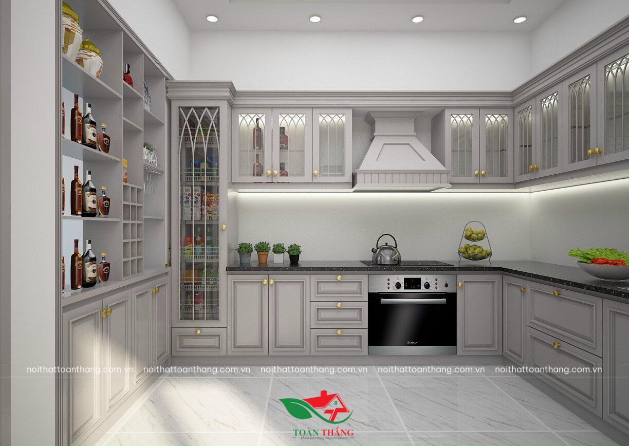 Mẫu tủ bếp theo phong cách tân cổ điển này nhận được rất nhiều lời khen đánh giá cao từ người dùng bởi thiết kế hiện đại. Để tiết kiệm tối đa cho diện tích căn bếp tủ bếp được thiết kế theo kiểu dáng hình chữ L. Dưới bếp được bố trí các kệ đựng bát, xoong nồi, người nội trợ có thể dễ dàng sắp xếp, dễ tìm kiếm. Khoang tủ được bố trí rộng rãi giúp bạn cất dữ đồ đạc, vật dụng chưa dùng đến.