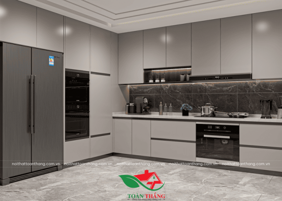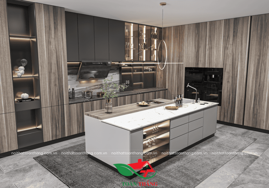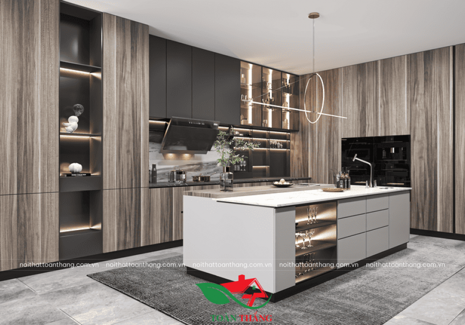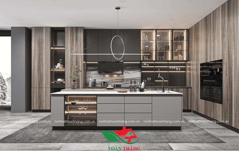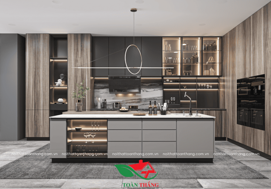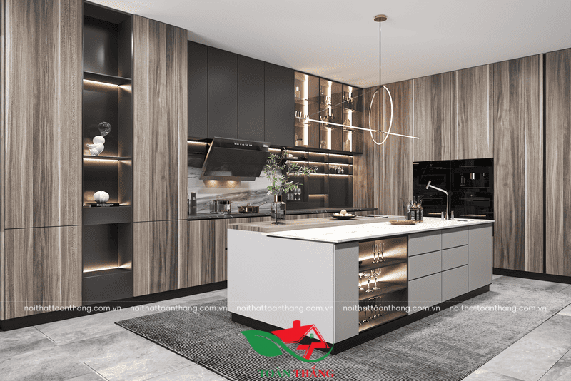 Tổng thể thiết kế mang lại cảm giác cao cấp, gọn gàng và rất hiện đại – đúng với tinh thần của các căn bếp mới hiện nay.