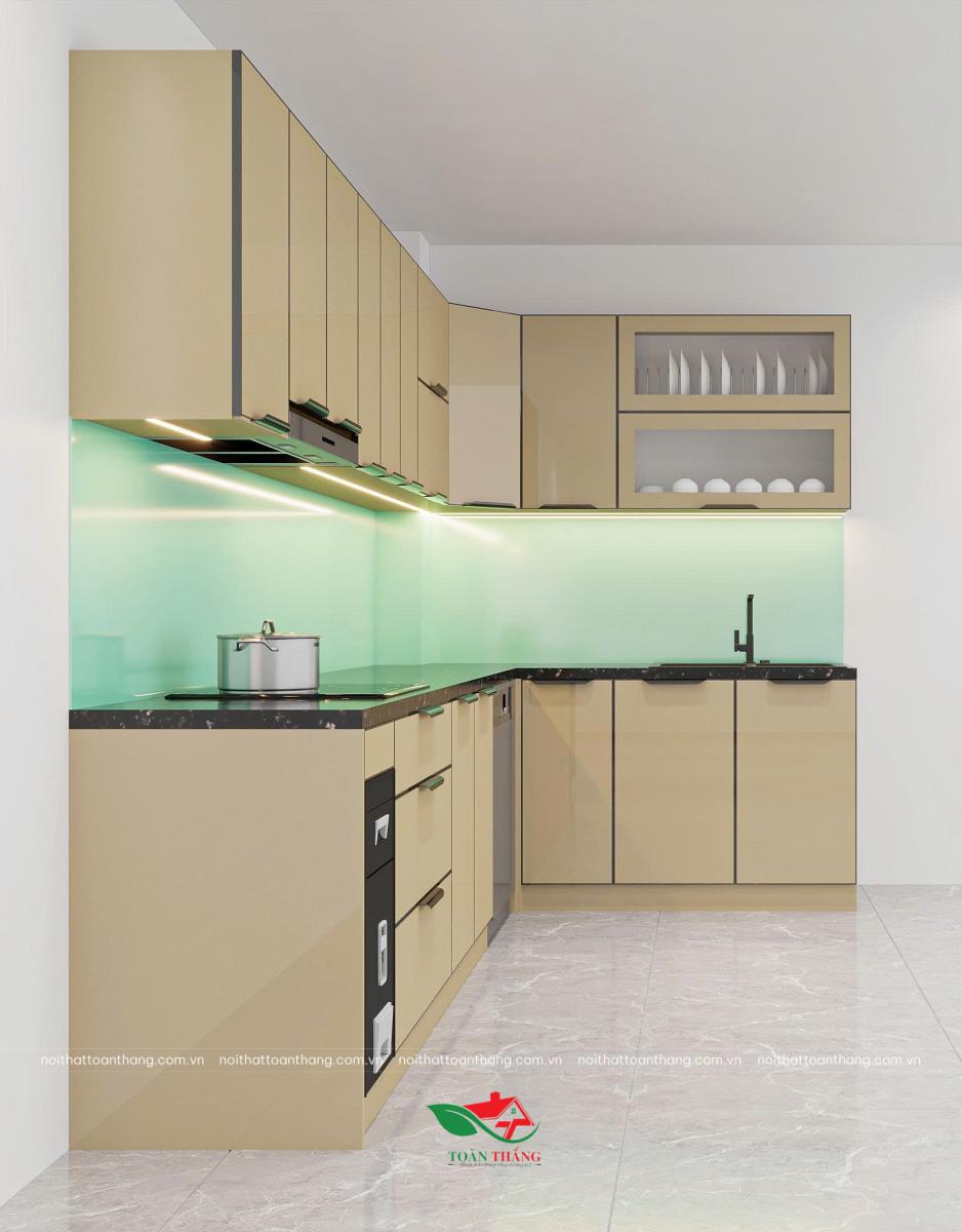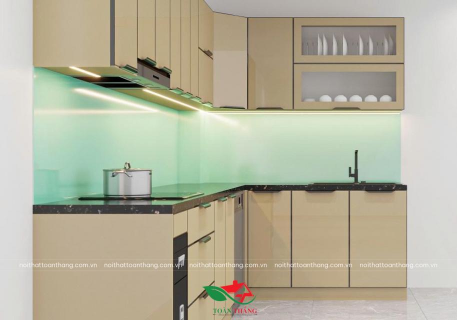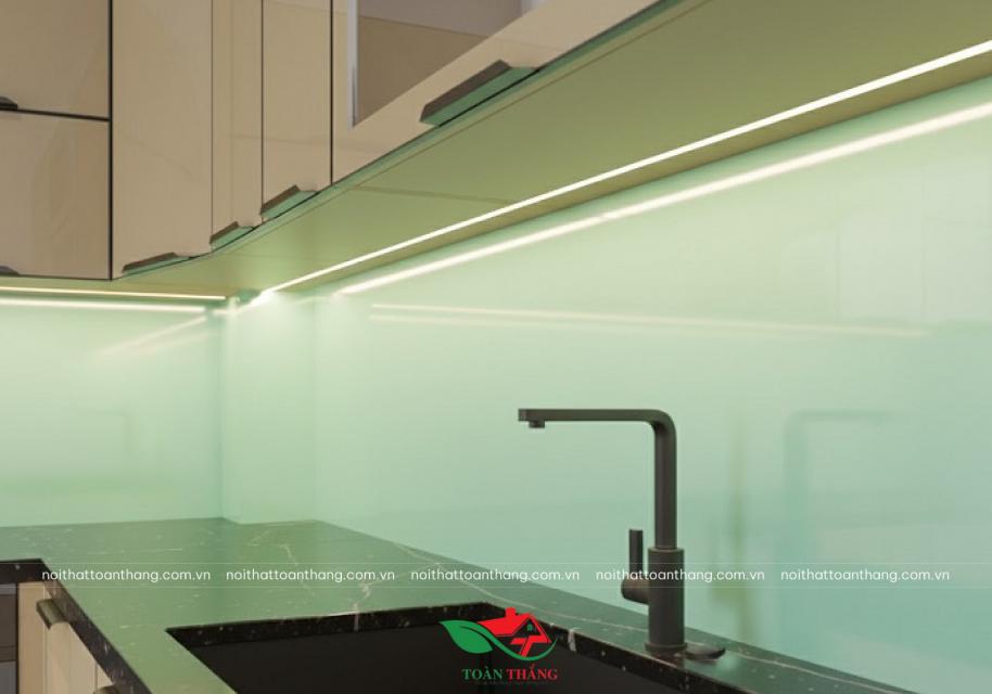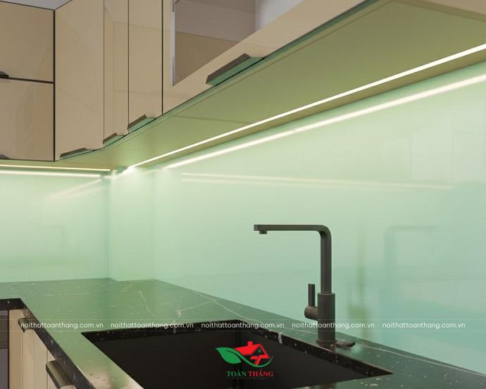 Khi kết hợp với kính ốp bếp xanh mint nhạt, toàn bộ không gian trở nên sáng, sạch và có chiều sâu thị giác, giúp bếp trông rộng hơn diện tích thực.