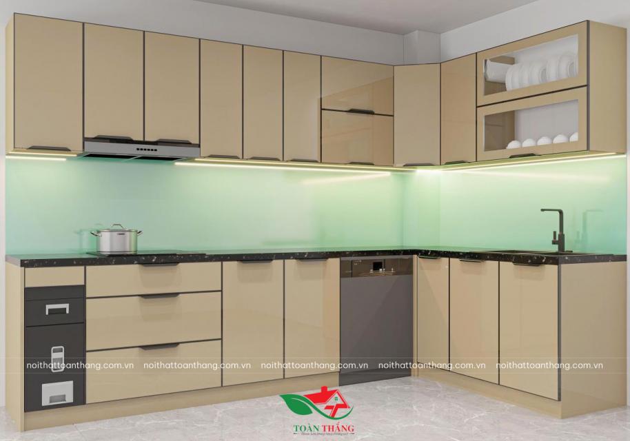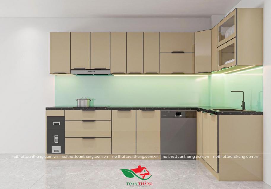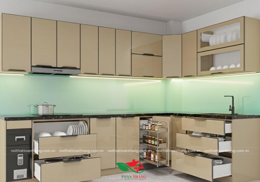 Mẫu thủ bếp inox cánh kính chữ L với tone màu nâu champagne điển hình cho xu hướng thiết kế nội thất nhà bếp cao cấp hiện nay. Không gian bếp với 1 tone màu sang trọng phù hợp với nhiều không gian nội thất từ chung cư đến nhà phố cùng hệ ngăn kéo thông minh với khả năng chứa đồ rộng rãi.