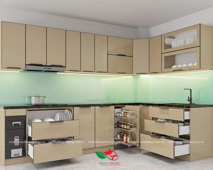 Thiết kế tủ bếp chữ L cho phép bố trí nhiều ngăn lưu trữ mà không gây rối mắt