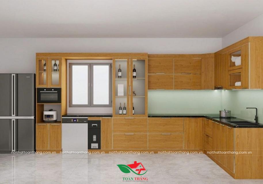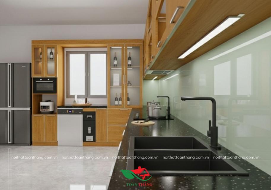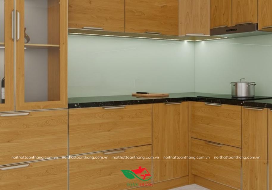 Thiết kế tủ bếp chữ L ôm trọn hai mặt tường giúp tận dụng tối đa diện tích, đặc biệt phù hợp với những không gian bếp có chiều ngang vừa phải. Phần tủ trên được làm cao kịch trần, vừa tăng sức chứa, vừa giúp bếp nhìn liền mạch và cao ráo hơn, tránh bám bụi ở nóc tủ.