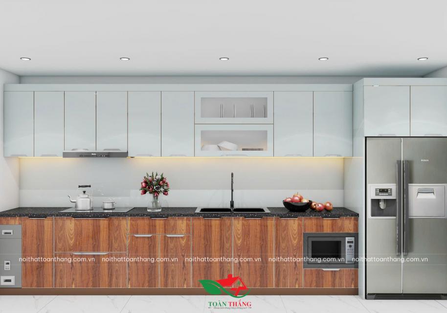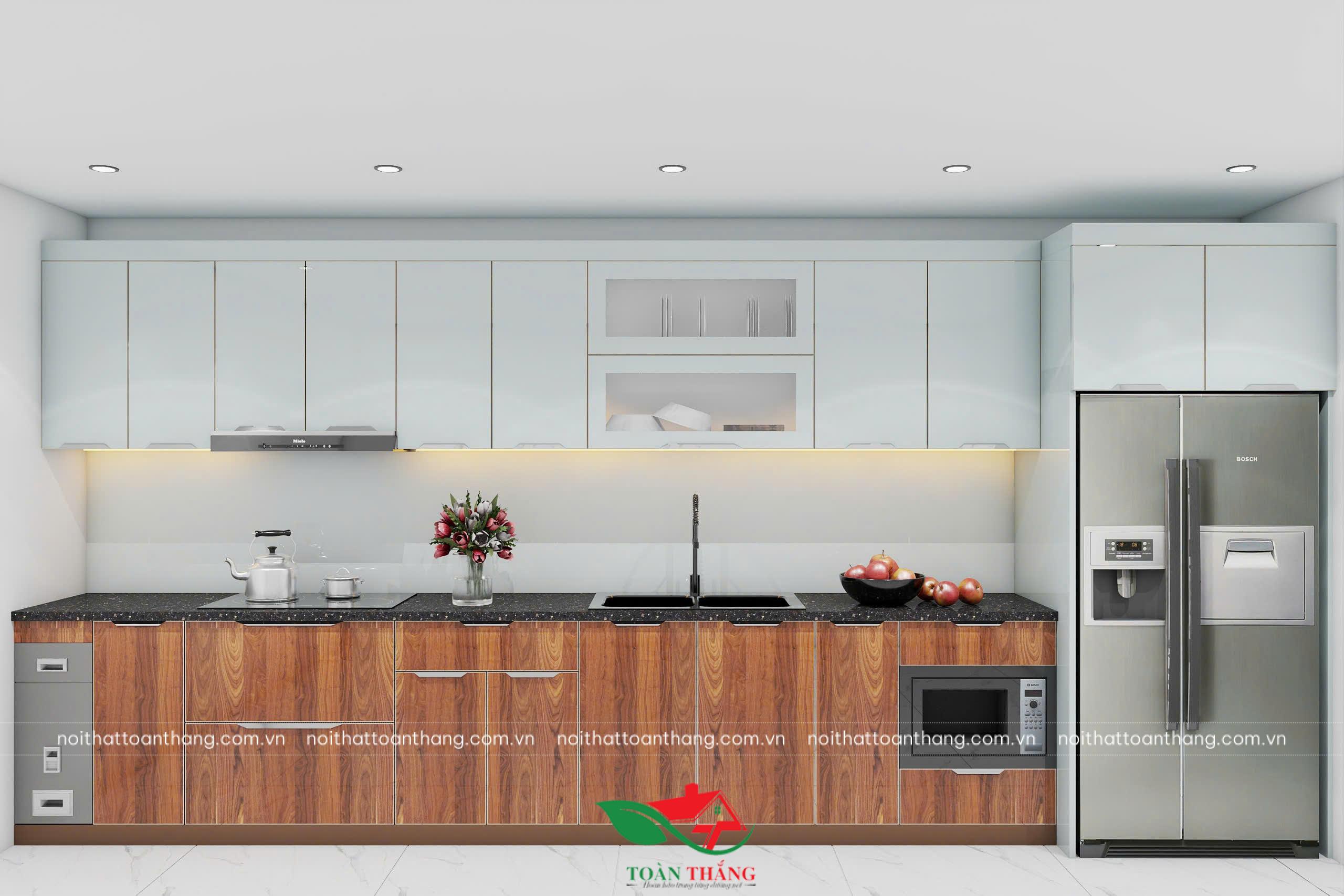 Bố Cục Chữ I (Tủ Thẳng): Bố cục tủ bếp thẳng được sử dụng tối ưu cho các không gian nhà phố hoặc căn hộ có chiều ngang hẹp. Thiết kế này tạo ra một trục làm việc liền mạch và trực quan. Việc tích hợp khối tủ cao (tủ lạnh và tủ đựng đồ khô) ở cuối dãy bếp (như trong hình) giúp tận dụng chiều cao và tạo sự phân chia chức năng rõ ràng giữa khu vực nấu nướng và lưu trữ lạnh.