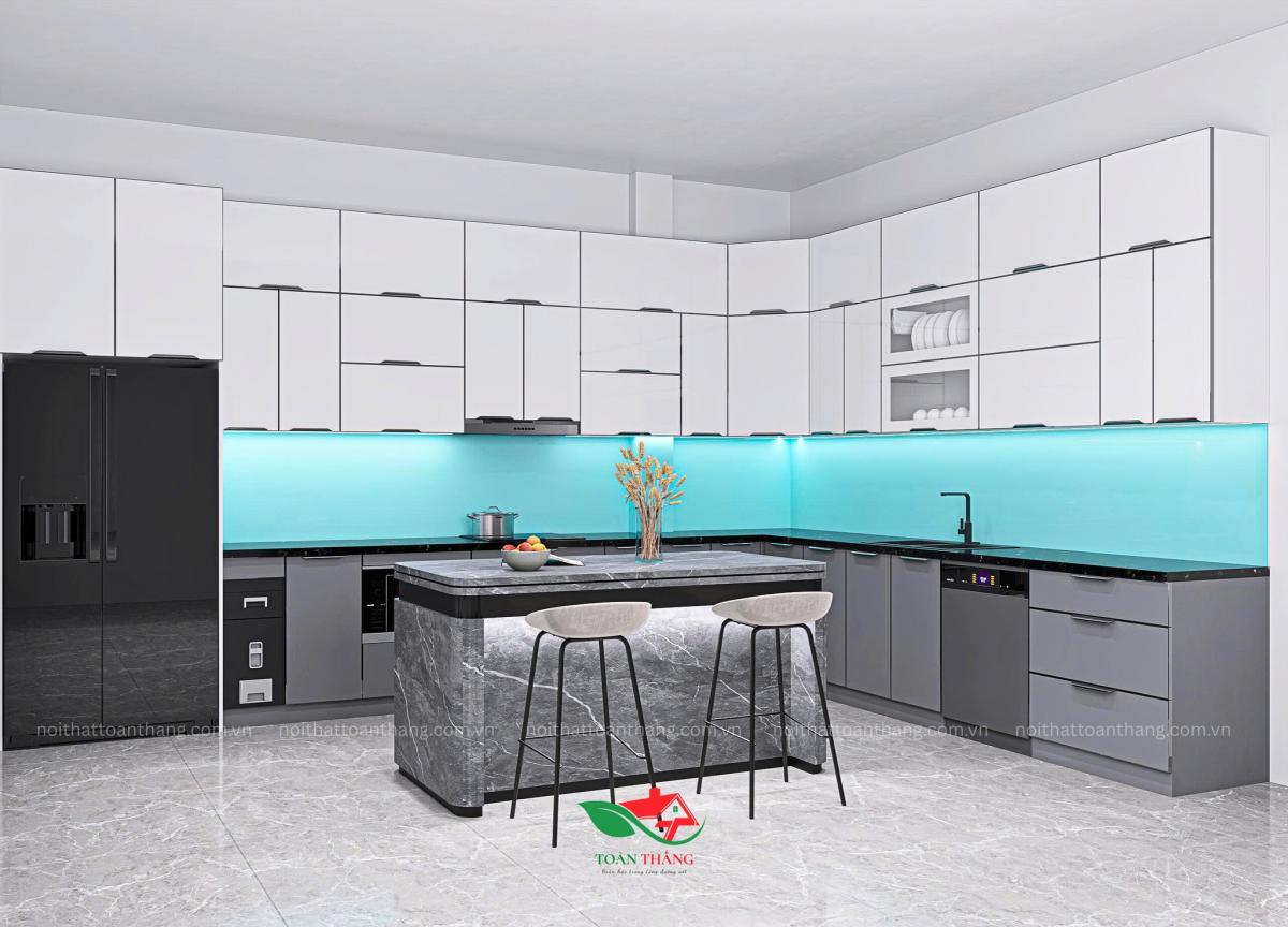 • Khi kết hợp mặt kính / mặt bóng gương, đảo bếp phản chiếu ánh sáng, tăng hiệu ứng sang trọng.